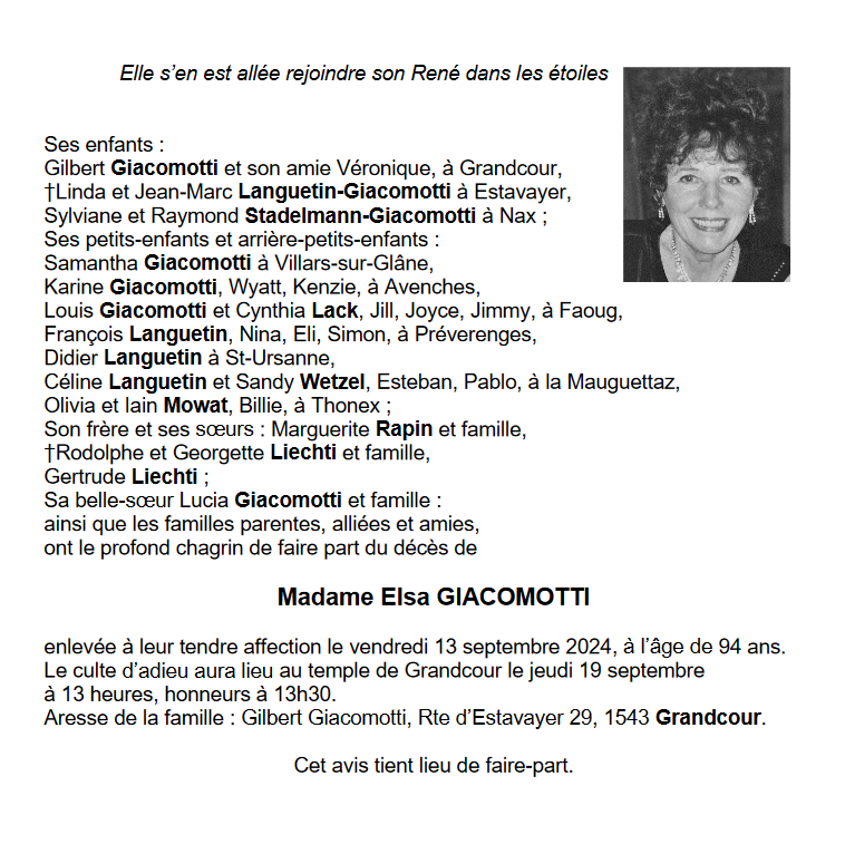 Madame Elsa GIACOMOTTI 12 mai. 1930 - 13 sep. 2024 Avis mortuaire PFG Télecharger PDF Partager sur: Galerie