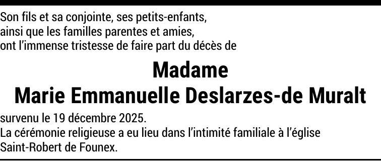 Madame Marie Emmanuelle DESLARZES-DE MURALT 10 jan. 1950 - 19 déc. 2025 Avis mortuaire PFG Partager sur: