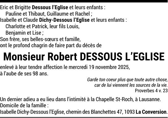 Monsieur Robert Dessous l’Eglise 15 sep. 1928 - 19 nov. 2025 Avis mortuaire PFG Partager sur: Galerie
